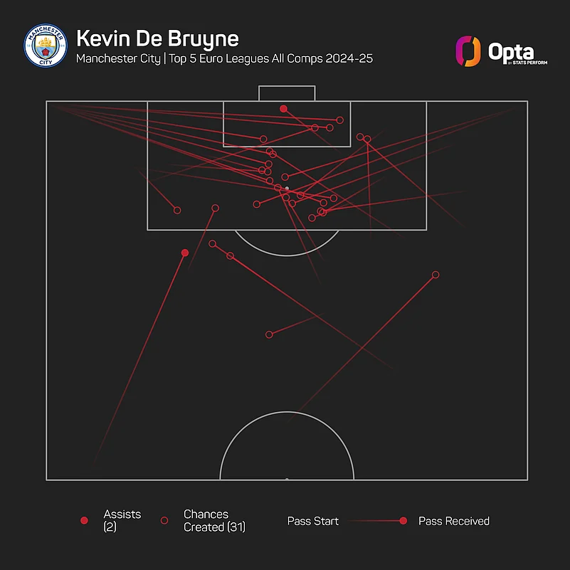In all competitions, De Bruyne is averaging 0.2 goals, 0.2 assists and 3.11 chances created per 90 minutes this term, with all of those figures being his worst in any season since at least 2017-18.