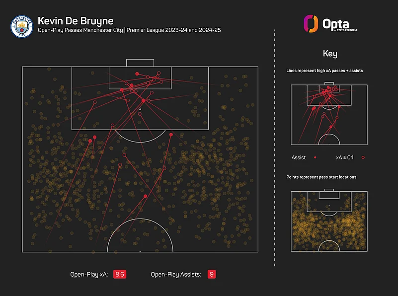 De Bruyne has managed just 23 Premier League starts since the beginning of last season. Nevertheless, he has created a league-leading 3.9 chances per 90 in that time (of players to feature for at least 450 minutes), while also leading the competition for expected assists (0.49) per 90.