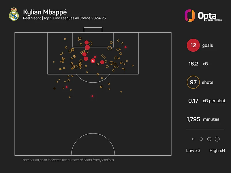 With Mbappe's goals coming from a total expected goals (xG) figure of 16.25, only one player from Europe's top five leagues has underperformed their underlying figures by a greater margin – Monaco's Breel Embolo (three goals from 7.7 xG).