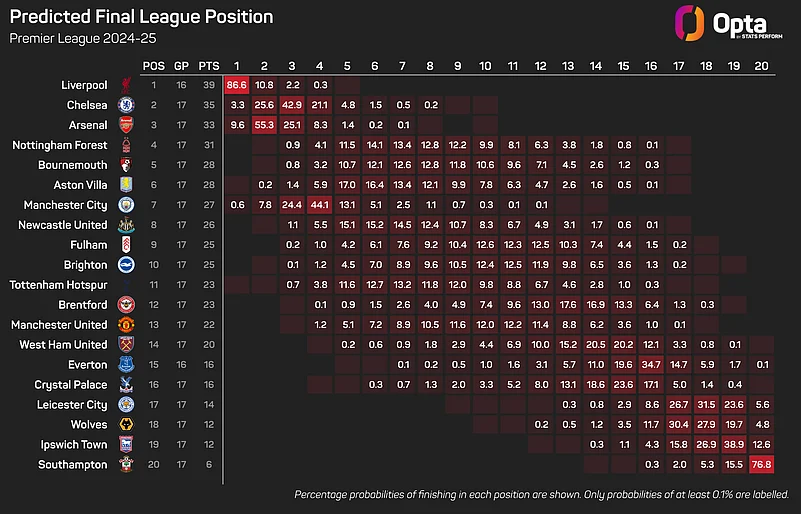 City's title chances are all but over. They are 12 points adrift of league leaders Liverpool, and down in seventh heading into Christmas. The Opta supercomputer hands them just a 0.6% chance of retaining their crown.