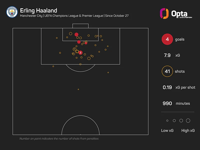 Haaland started the season by scoring 14 goals in 13 games in all competitions, averaging a goal every 81 minutes, with a shot conversion rate of 23.3%.