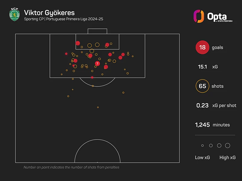 Gyokeres has scored 18 goals in 14 league outings in 2024-25, the most of any player in Europe's top 10 leagues, ahead of Robert Lewandowski (16), Harry Kane (14), Erling Haaland and Mohamed Salah (13 apiece).