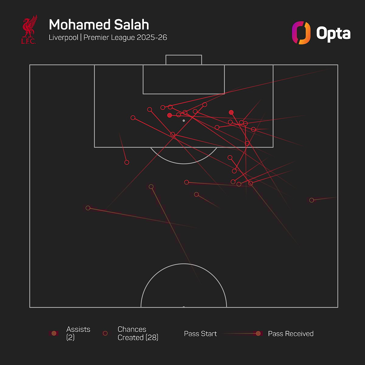 No team has had more different players create 20+ chances than Liverpool in the Premier League this season (four, level with Chelsea) – with Salah ahead of Cody Gakpo (25), Dominik Szoboszlai (24) and Florian Wirtz (20).
