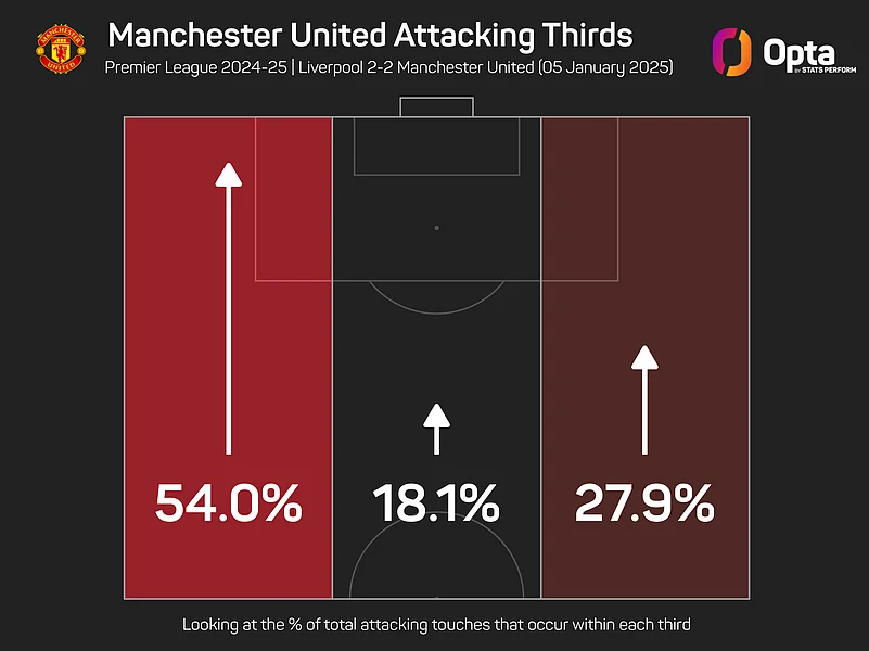 The Red Devils targeted 54% of their attacks down their left-hand side throughout the game, compared to just 27.9% down their right.