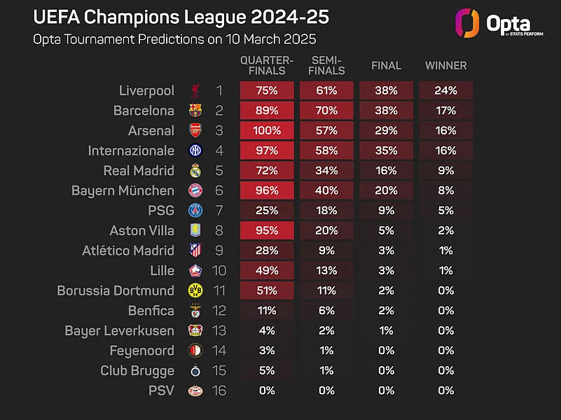 PSG are given just a 25% chance of reaching the quarter-finals of the competition according to Opta's data-led simulations.