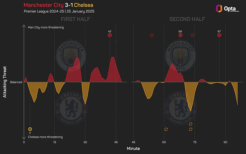 City enjoyed 57% of the possession on Saturday and won the expected goals battle comfortably, with their 15 shots totalling 2.7 xG to Chelsea's 1.61 from 10 efforts.