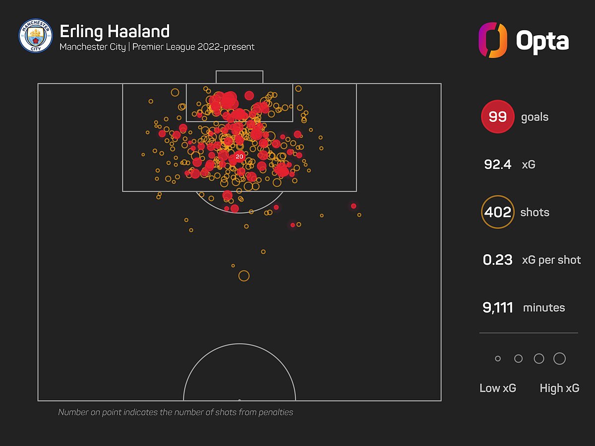 The Norwegian's next Premier League goal will be his 100th, and he has scored in each of his last five league games at the Etihad Stadium, only enjoying a longer such run between August and November 2022 (six) when he first joined the club.