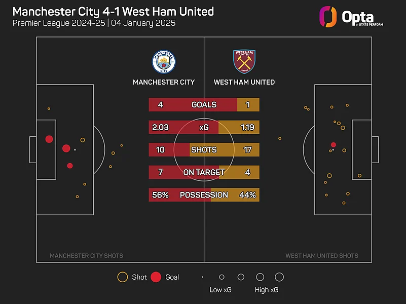 Though West Ham posted more shots (17) than their opponents, City's quality in the final third told, accumulating an expected goals (xG) total of 2.03 from their 10 attempts.