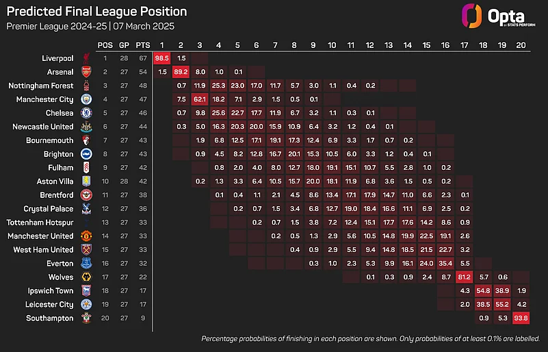They are given just a 5% chance of finishing in the top half this season by the Opta supercomputer, and most commonly finish 15th in the season simulations (22.5%).