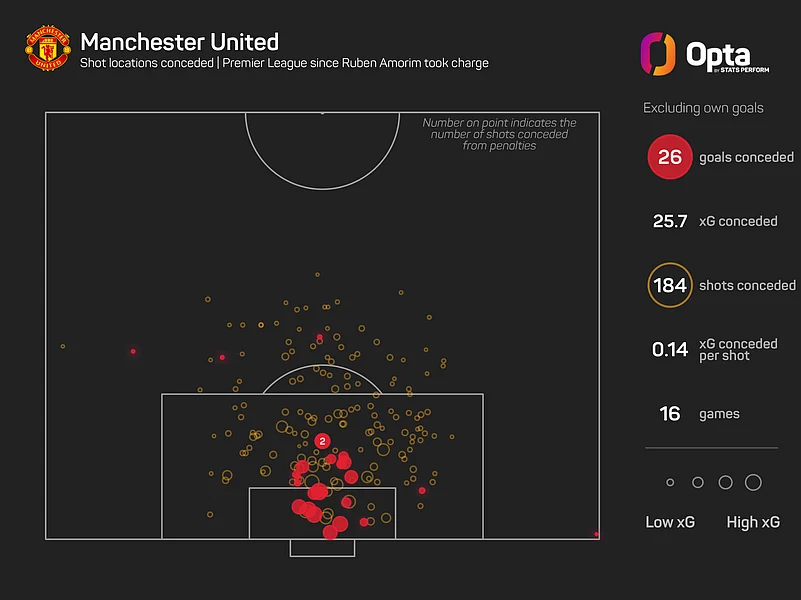 The Red Devils have struggled at times in Amorim's preferred 3-4-3 formation as their problems continue to mount. In that time, they have faced 25.65 xGA (expected goals against) and conceded 27 goals, with only six teams letting in more.