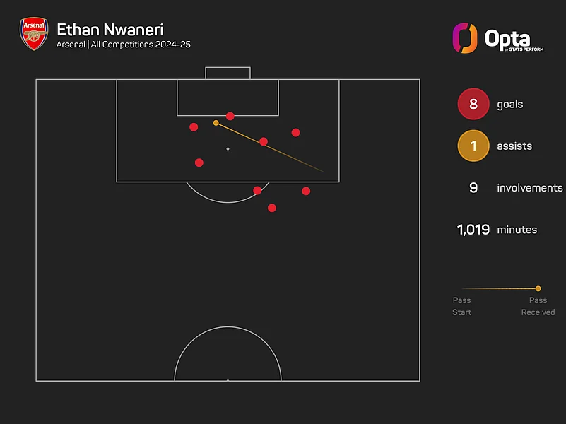 With Arsenal's injury troubles up front in recent weeks, Nwaneri has stepped into the role, providing an outlet for the Gunners.