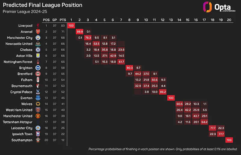 United's hopes of signing off their dismal season with a win, meanwhile, sit at 24.9%, with the likelihood of a draw being 23.3%.