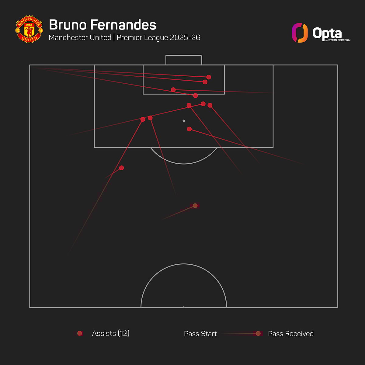 Bruno Fernandes has more assists than any other Premier League player this season, with his 12 also his joint-best tally in a single campaign (level with 2020-21).