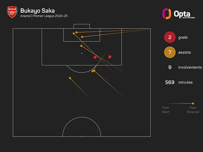 The England international leads the way for chances created (27), big chances created (12), assists (seven) and expected assists (3.16) in the Premier League this season, while only Manchester City's Bernardo Silva (19) has crafted more opportunities from open play than Saka (17).