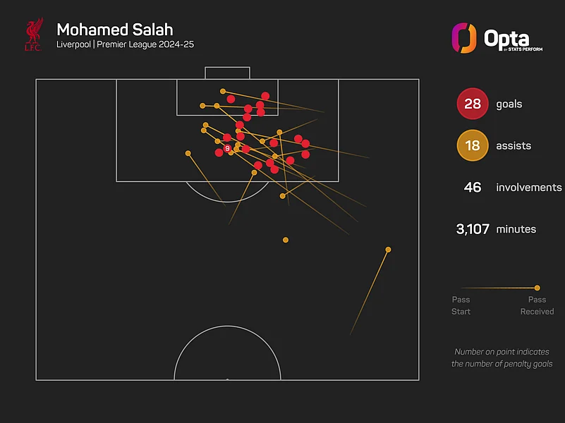Salah has enjoyed a standout season in 2024-25, netting 28 Premier League goals and adding a further 18 assists.