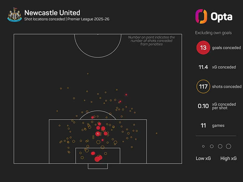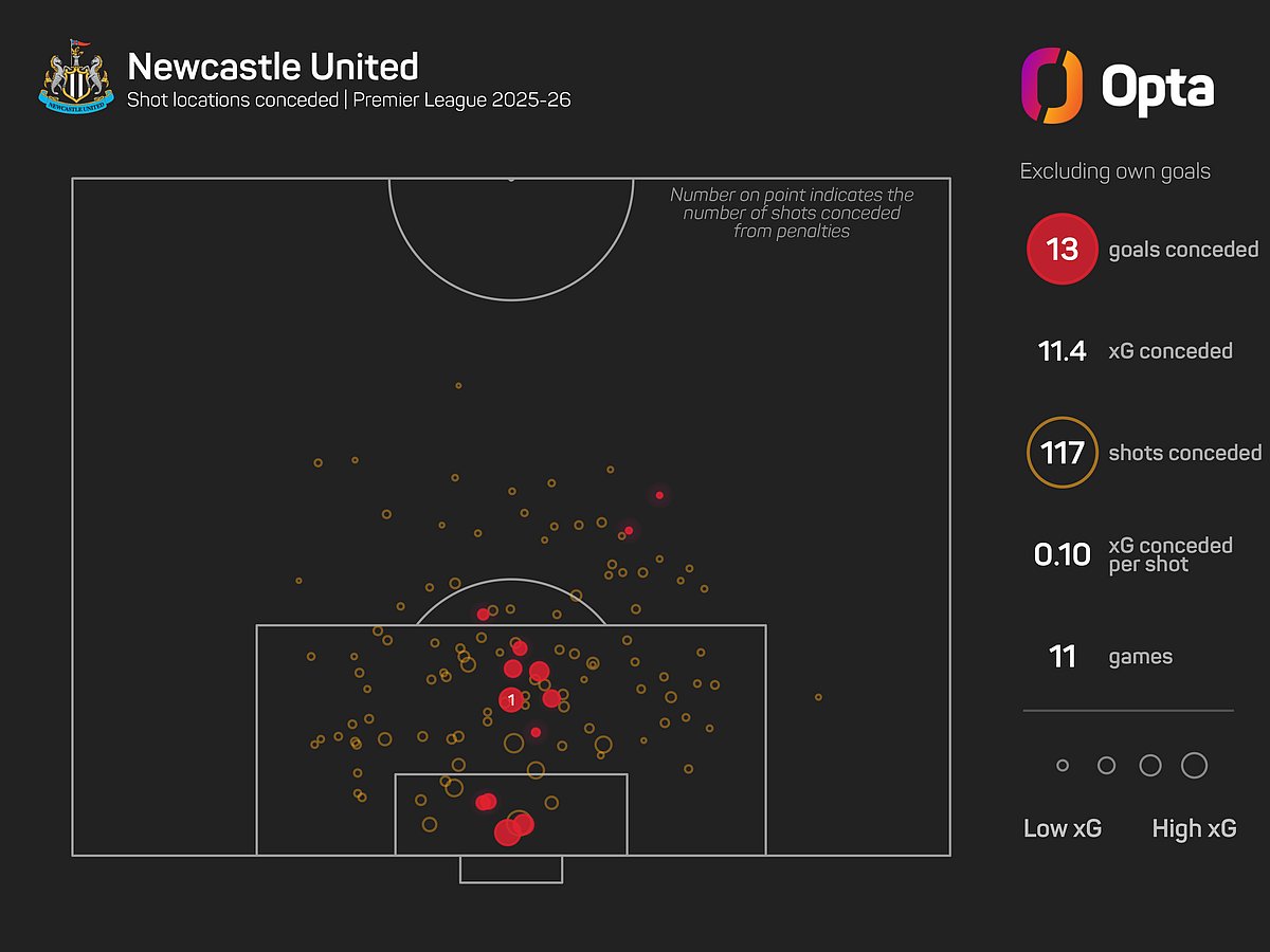 Only City (10.4) and Arsenal (6.1) can boast a lower expected goals against (xGA) figure than Newcastle (11.4) in the Premier League this season; Howe's team have also kept five clean sheets, which ranks joint-second, behind Arsenal's seven.