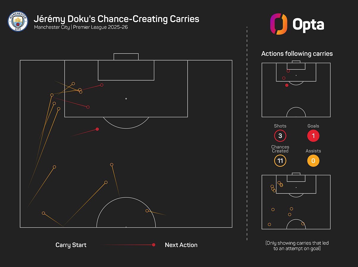Doku already has four assists to his name in the league, while he has created the joint-most chances from open play (23), along with Jack Grealish.