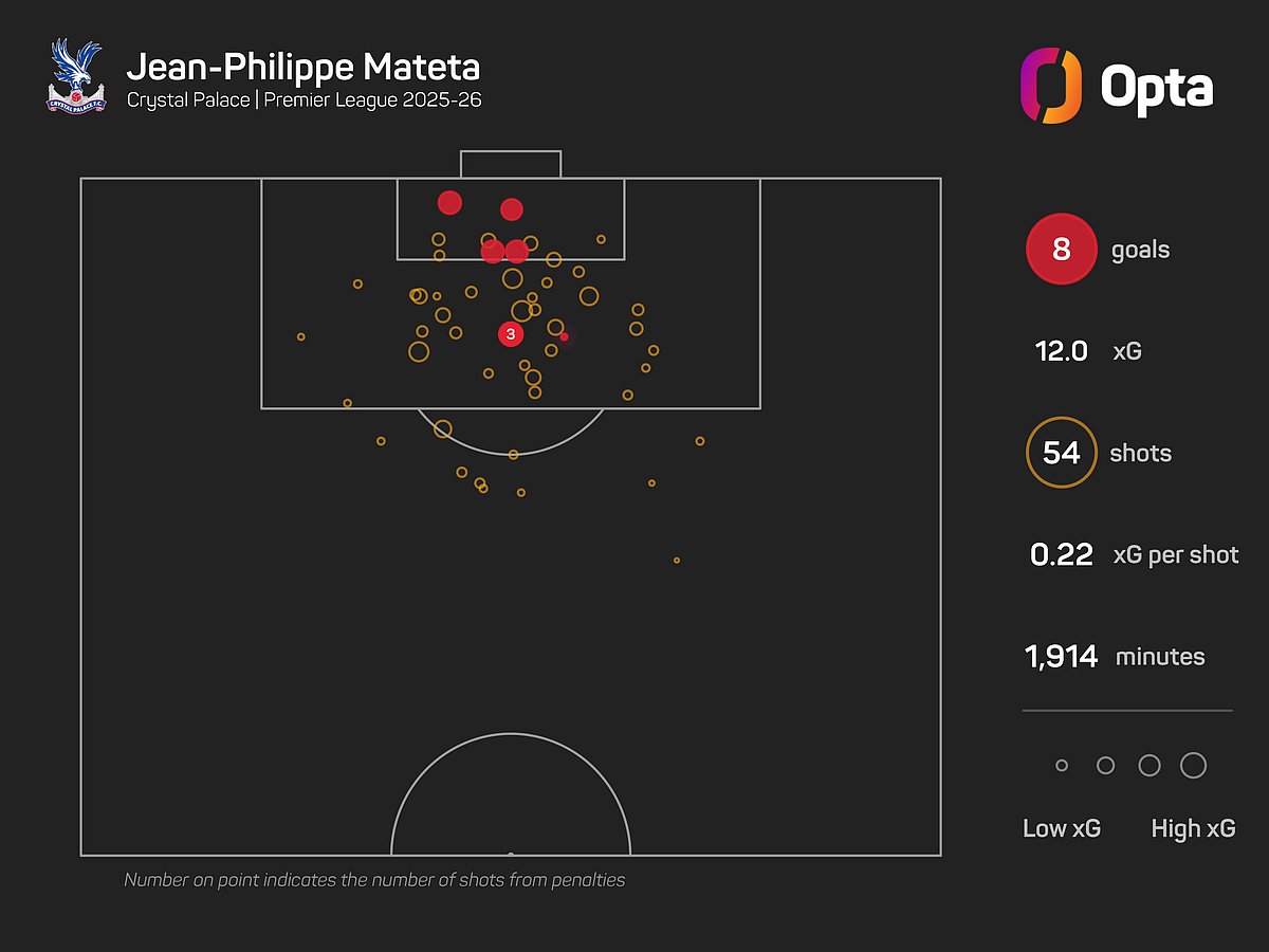 The Frenchman has scored eight goals in 23 Premier League outings this season, though he has underperformed his expected goals (xG) figure of 12.0 and has not scored since a 1-1 draw with Fulham on New Year's Day, with Palace going eight league games without a win.
