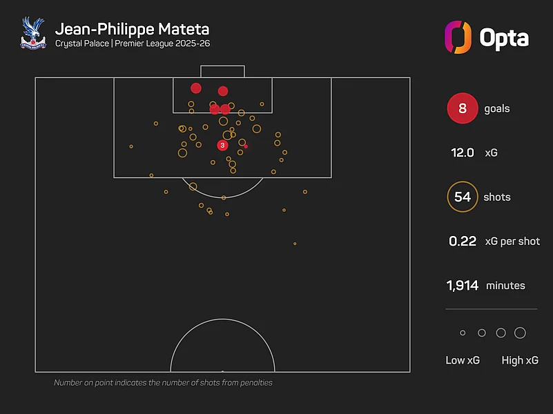 He also ranks second in their squad, behind Mateta in both instances, for shots (34) and touches in the opposition box (66).