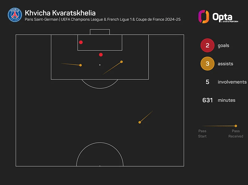 Indeed, since his debut in Ligue 1 on January 25, he has created more chances (12) than any of his PSG team-mates, while only Ousmane Dembele (13) has completed more dribbles than Kvaratskhelia (12).