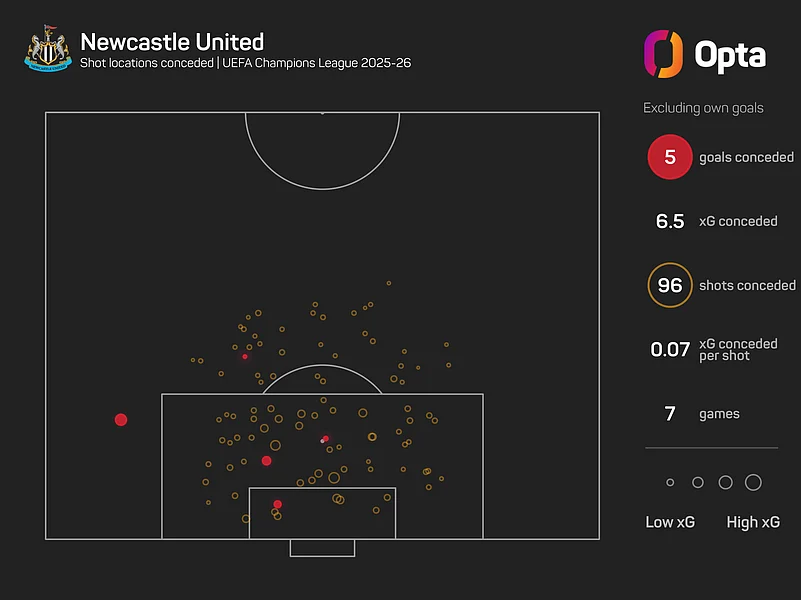 Only Arsenal (5.0) and Liverpool (6.2), meanwhile, can boast a lower xG against figure than Newcastle's impressive 6.4, and Howe's back line will have to be at its best to keep out a team that has registered the most shots (148) and shots on target (54) in the Champions League this term.