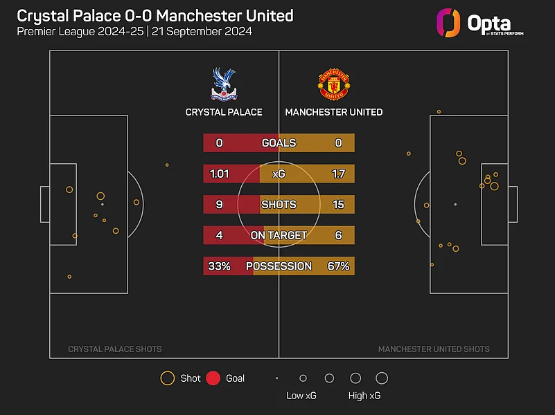 United had six shots on target, but found their former goalkeeper Dean Henderson in fine form, with Palace's expected goals on target (xGoT) conceded coming in at 1.9, showing just how well their shot-stopper performed.