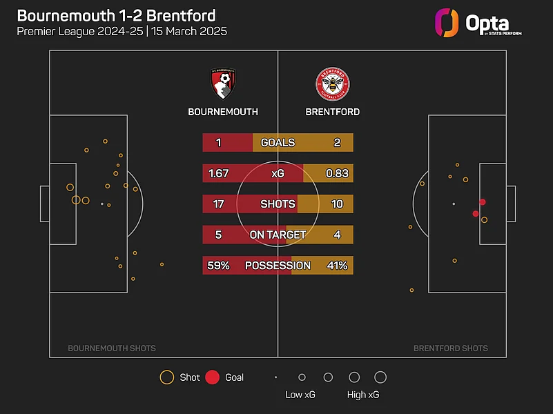 But Brentford converted 20% of their attempts, compared to Bournemouth's 5.88% conversion rate. Thomas Frank's team only registered 0.83 xG, but their expected goals on target was at 2.22, showing a high calibre of finishing.