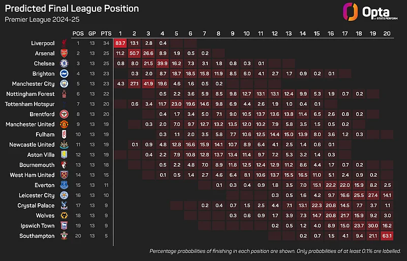 Sunday's defeat left them 11 points behind Liverpool after 13 games, and their title hopes are dangling by a thread. Indeed, the Opta supercomputer gives City just a 4.3% chance of retaining the title.