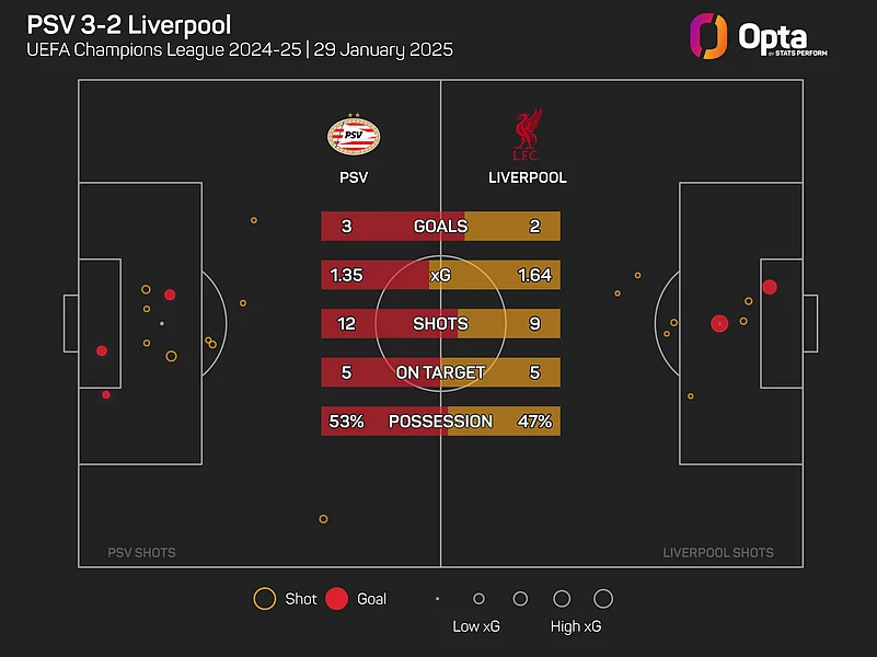 The Reds both scored and conceded two or more goals in the first half of a Champions League game for the third time (also v Atletico Madrid in October 2021 and Real Madrid in February 2023), while PSV did so for a second time in the competition (also v Rostov in September 2016).