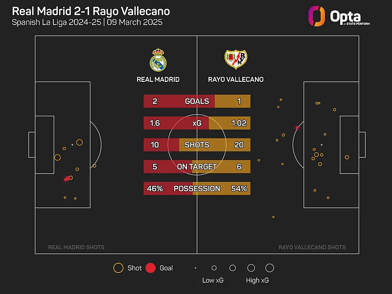 Vallecano ended the contest with an expected goals (xG) total of just 1.02 to their opponents' 1.6, despite having double the attempts on target against the champions.