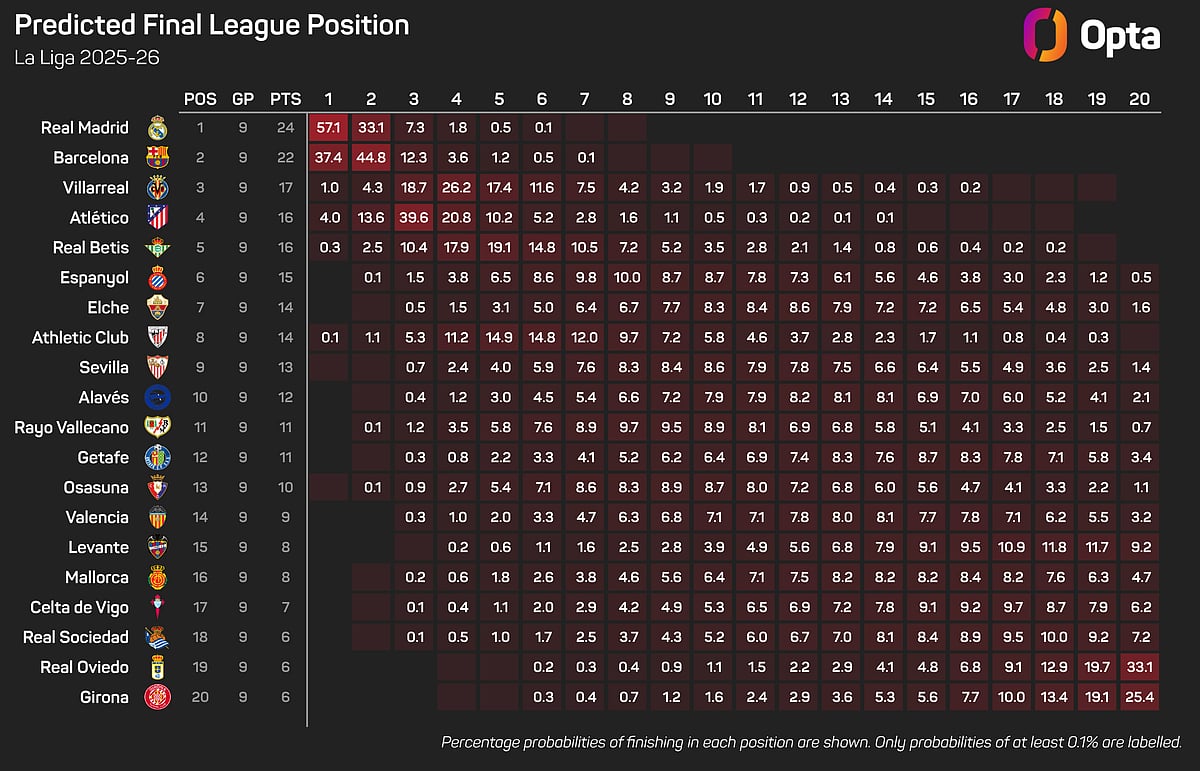 And, having only dropped points once, in a 5-2 loss to Atletico Madrid last month, Los Blancos are now the supercomputer's favourites to win LaLiga.