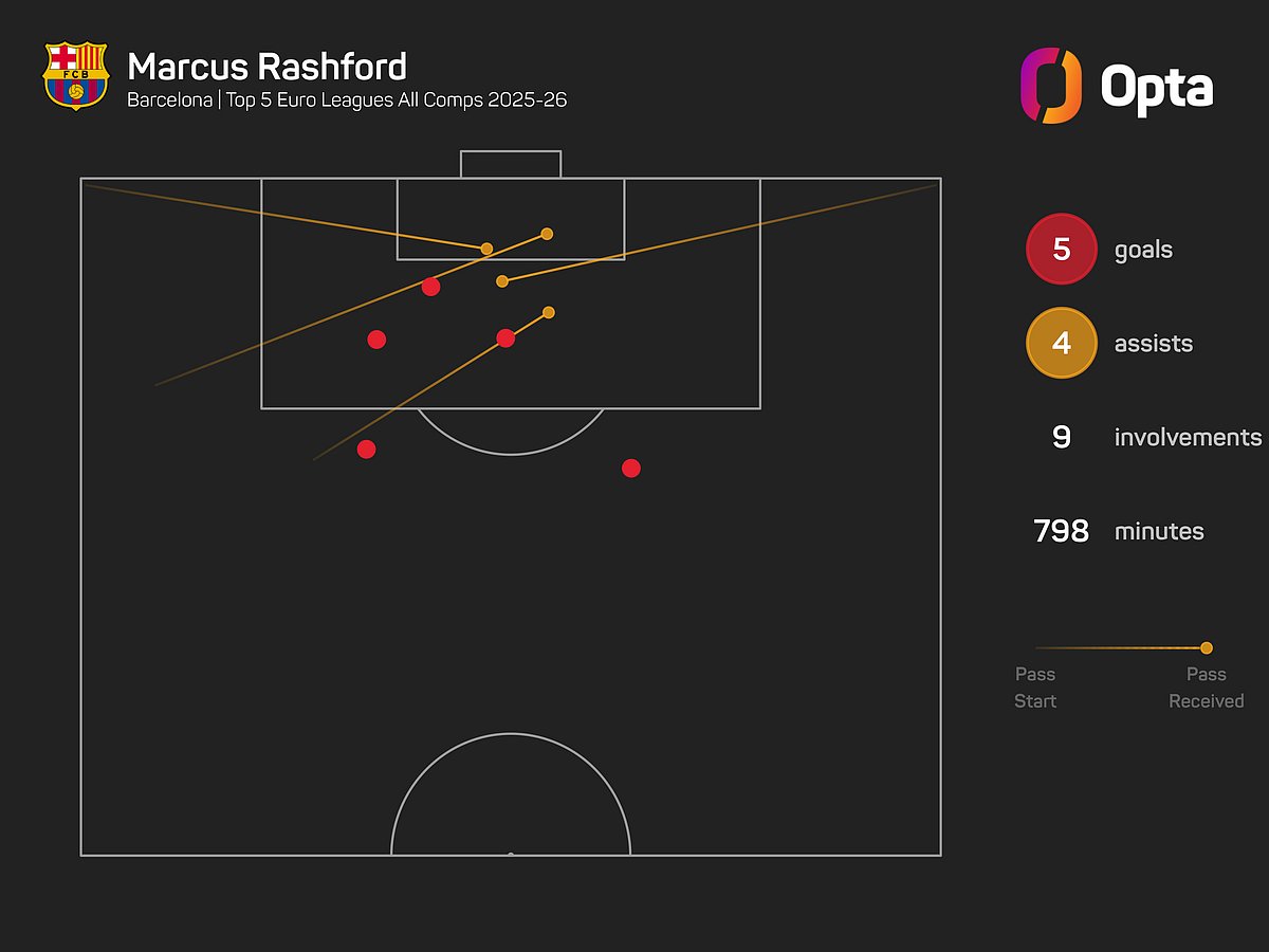 Marcus Rashford has more goal involvements than any other Blaugrana player this term, scoring five times and adding four assists to sit one clear of Lamine Yamal (eight – three goals, five assists).