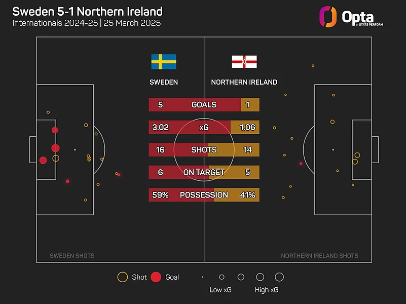 Sweden only just outshot Northern Ireland, having 16 attempts and facing 14, though their chances had a total value of 3.02 expected goals (xG) to Northern Ireland's 1.06.