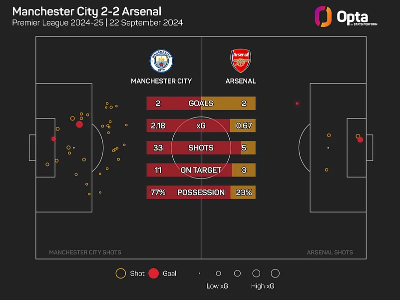 Having won 12 consecutive league games against Arsenal between 2017 and 2023, City are now winless in their last three against them (two draws, one loss).