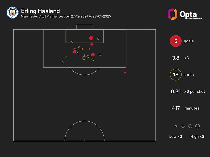 However, something has clicked for Haaland since he netted in City's final outing of 2024 – a 2-0 victory at Leicester City. He has five goals in his last five Premier League appearances, exceeding his xG figures by 1.1 (3.9 xG).