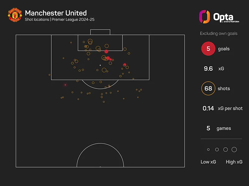Their total expected goals (xG) figure of 9.6 for the season is the third-highest in the Premier League, behind only title contenders Manchester City (11.46) and Liverpool (10.1). However, United have only hit the net five times, giving them an xG underperformance of 4.6.