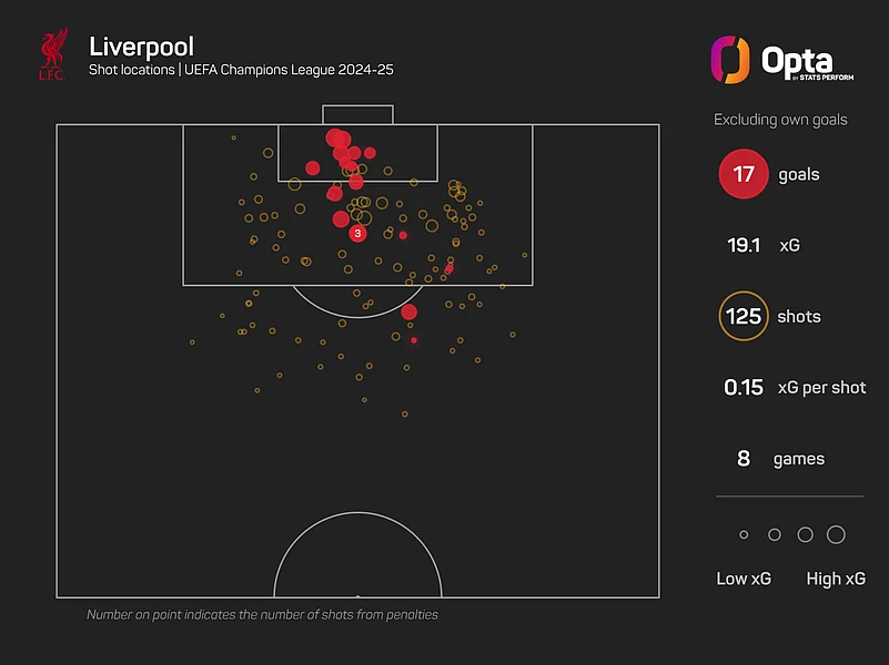 Liverpool's attack was not always firing on all cylinders in the league phase, yet Slot's team finished top of the league phase.