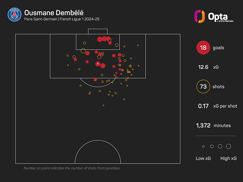 He has netted 26 goals across all competitions for PSG, adding six assists. Dembele has managed to outperform his own 19.49 expected goals (xG) by 6.51, showing just how on point his finishing has been.