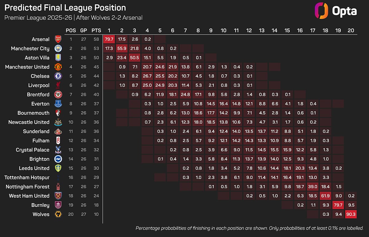 The Opta supercomputer still makes Arsenal favourites to win the title, with a 79.7% probability, but that figure stood at 85.1% before the Wolves game.