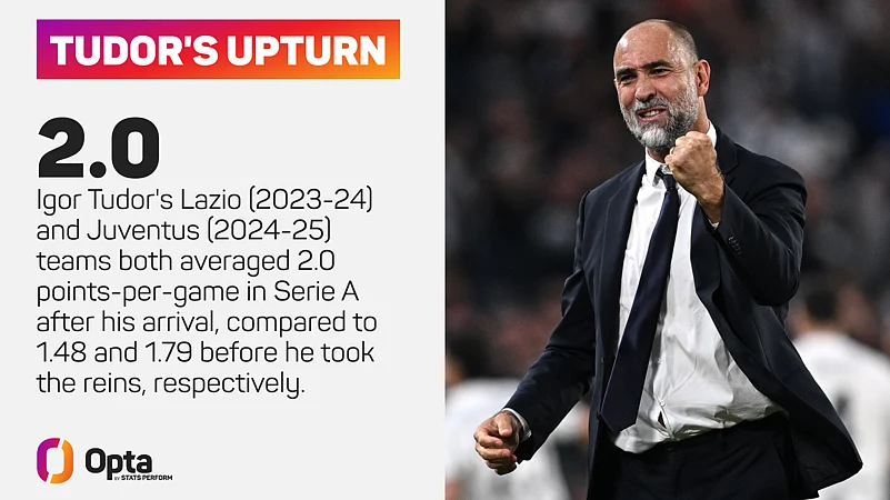 Udinese went from 0.97 to 1.75 in 2017-18, then 0.93 to 1.64 when he returned in 2018-19. Verona were pointless when he took over in 2021-22 and picked up 1.51 points per game under him. And both Lazio (2023-24) and Juventus (2024-25) averaged exactly two points per game with Tudor in charge, having averaged 1.48 and 1.79 before him.