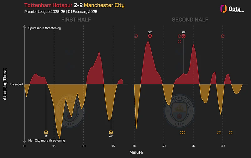 But City will certainly feel like this is two points lost, especially given they had an expected goals (xG) total of 1.99 from their 15 shots, though only three were on target, compared to Spurs' 0.97 from 12 attempts.