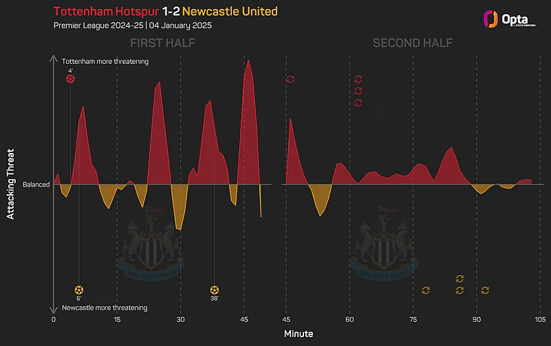 Anthony Gordon and Alexander Isak both netted for the Magpies in the first half after Dominic Solanke's early opener for Spurs, extending Newcastle's winning streak to six games in all competitions.