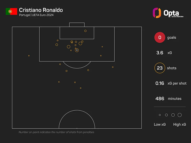 The Euros' record goalscorer could not add to his tally, not that it was down to a lack of trying. Indeed, Ronaldo had 23 shots without scoring at Euro 2024, with only another Portuguese great, Deco, having more attempts without registering at least one goal in a single edition of the Euros (24 at Euro 2004).