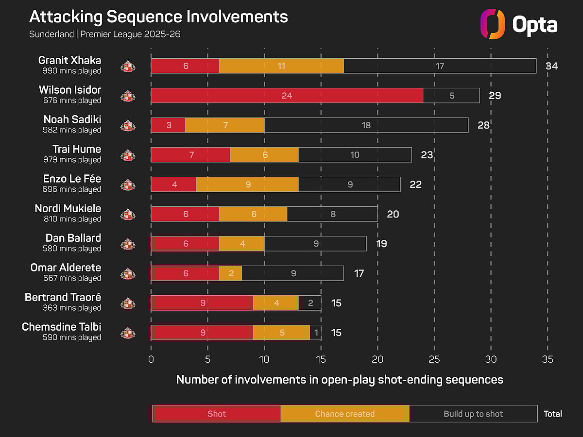 In the league this season, Xhaka leads Sunderland for assists (three), expected assists (1.2), successful passes (494), passes played into the box (60), chances created (16), and duels won (67).