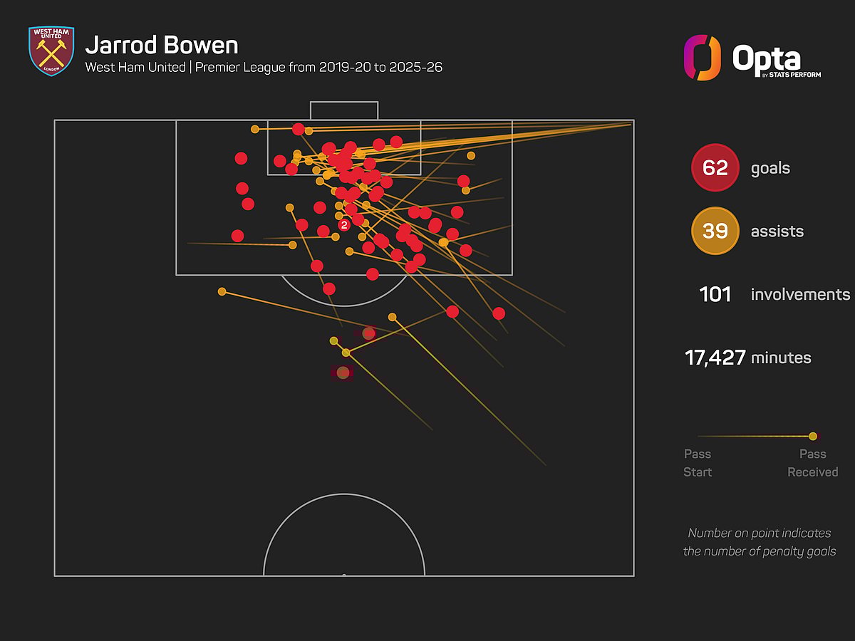 With his goal against Brighton, Bowen equalled Michail Antonio for the most combined goals and assists recorded for West Ham in the Premier League (101 each).