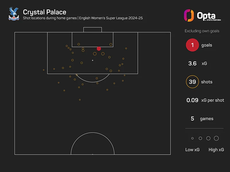 Palace have not had the success they would have liked in their debut season. They have picked up just one point and scored only one goal in their five WSL home games (D1 L4), with only Yeovil Town winning fewer points (0) and no side scoring fewer goals after as many matches on home turf in the competition (Notts County also one goal).