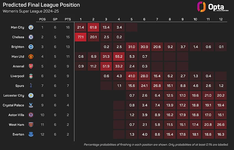 West Ham are, however, the team that is most likely to finish bottom of the WSL this term, according to the supercomputer.