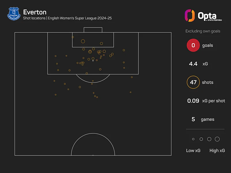 They have scored just once, an own goal by Camila Saez against West Ham, meaning they have the biggest xG underperformance, having created 4.42.