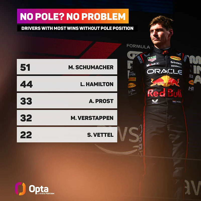 Verstappen has won 32 times without starting from pole position. If he repeats the trick in Spain, it will be the 33rd time that he has reached the top step without starting at the front of the field, equalling Alain Prost for the third-most all time.
