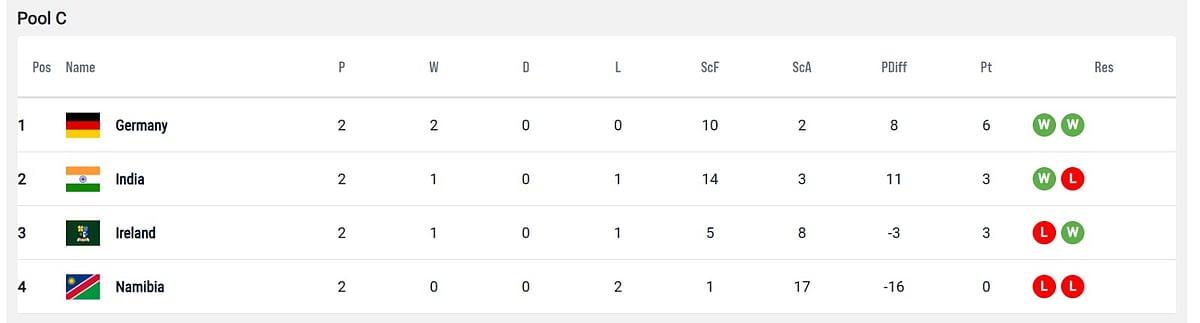 India are currently second in Pool C with three points, behind leaders Germany who have a perfect six points. The Germans take on Namibia later in the evening and are expected to win, in which case India will have to fight for the two best runner-up slots from the six groups, for a quarter-final berth.
